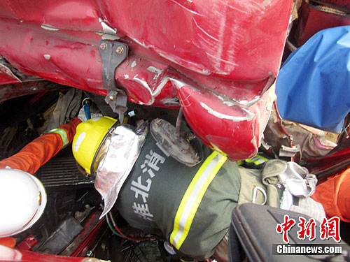 货车驾驶室内驾驶员大腿部被卡,在严重变形的驾驶室里动弹不得,另外一名司机被卡在驾驶座上。他说,当时高速路上出现团雾,他打开了雾灯,也把车速降低了,正在行驶时,前面的车一下停住了,自己踩着刹车还是撞了上去,他的头撞在方向盘上,窗户玻璃已被震碎,引擎盖变形,他自己也是满脸血迹。