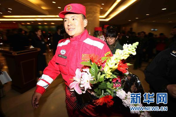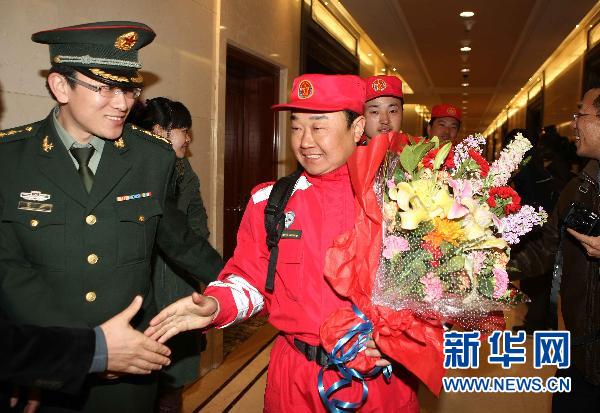 3月21日,在北京首都国际机场,中国国际救援队队员在迎接仪式上。当日零时许,中国国际救援队在圆满完成日本地震海啸灾区救援任务后顺利返回,抵达北京首都国际机场。