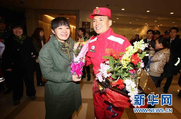3月21日,在北京首都国际机场,中国国际救援队队员陈庆开(前右)的妻子张虹霞(前左)前来接机。当日零时许,中国国际救援队在圆满完成日本地震海啸灾区救援任务后顺利返回,抵达北京首都国际机场。