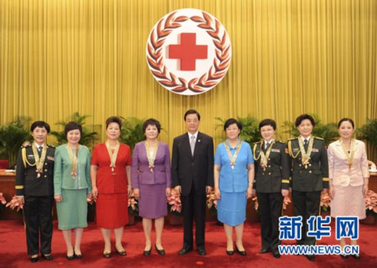 李克强等出席大会。这是胡锦涛在大会上为第43届南丁格尔奖章8名中国获奖者颁奖。新华社记者刘建生摄