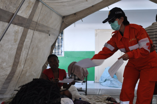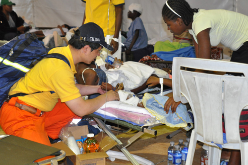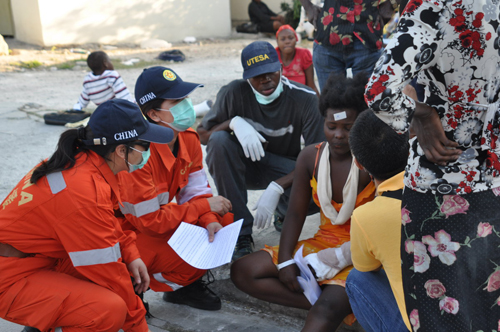 中国领导人十分关心在海地的中方人员、港澳台同胞、华侨华人的安全,特别是中国驻海地维和人员,并就尽快采取救援行动作出了部署。中国国际救援队医疗队在海地震区开展了流动医疗救护,并在总理府前设立了医疗救护点,为受伤灾民提供医疗救助,承担被压埋伤员的救治、维和部队人员的巡诊任务,同时开展卫生宣教、卫生防疫工作。目前已救护了数百名伤员。